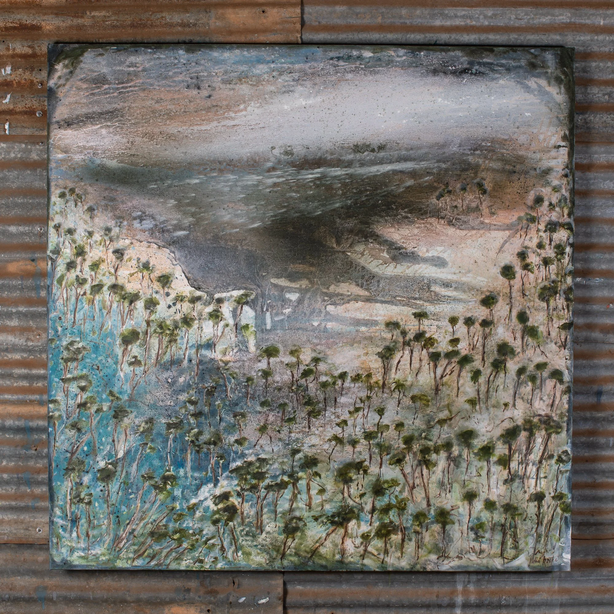 These large format oil landscapes included in this exhibition were created on Wiradjuri country, working plain-air under the cover of night. Roche began each painting on elevated parts of her family farm and worked into the night - mark making shadows and silhouettes. She relied on the elements, mainly wind and dew, to help direct and manipulate the mediums.